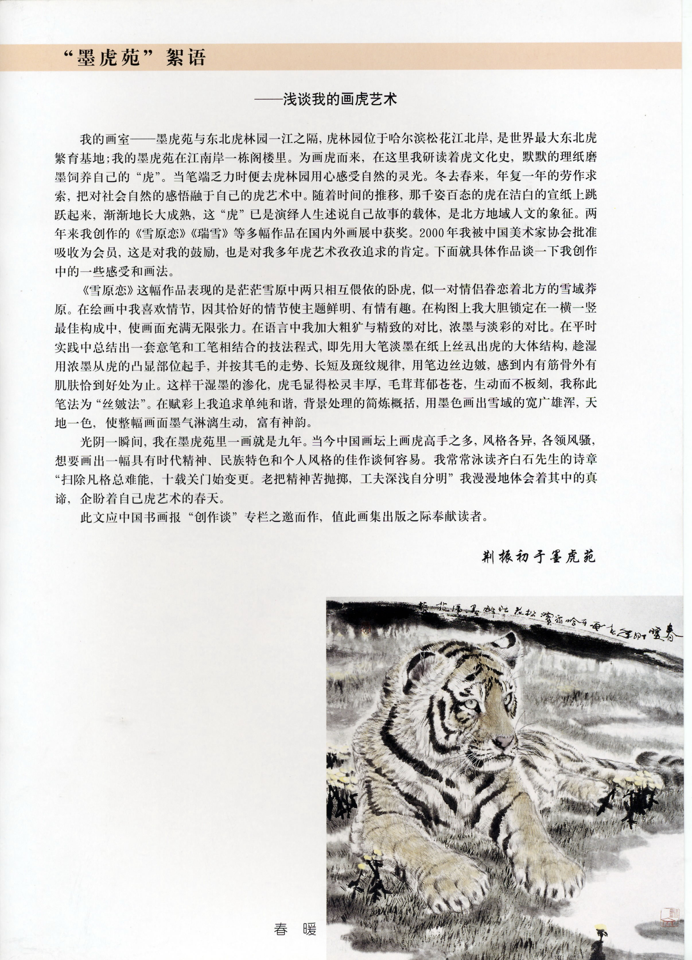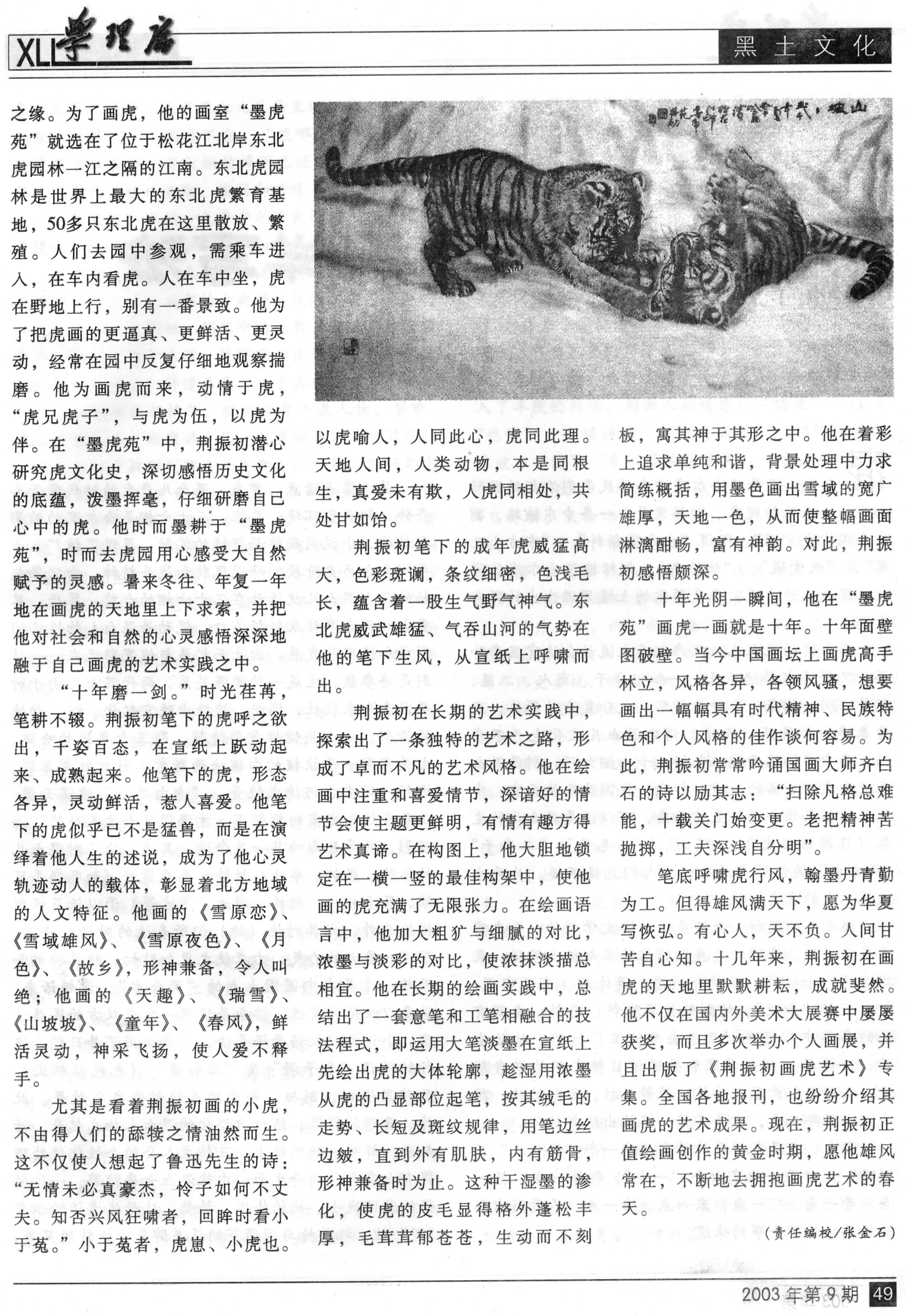 今有荆振初者,山东省海阳人也,长期扎根于哈尔滨松花江畔,以画东北虎见长。